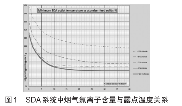 1)為_布袋除塵器正常工作,要求所過(guò)濾煙氣的溫度要高于其露點(diǎn)溫度,以避免煙氣中的氣態(tài)水在布袋表面凝結(jié)結(jié)露。在實(shí)際運(yùn)行過(guò)程中,除塵器系統(tǒng)絕熱保溫差、煙氣中的氯離子含量過(guò)高等因素,都會(huì)直接影響煙氣的露點(diǎn)溫度,一旦控制不當(dāng)_會(huì)出現(xiàn)結(jié)露現(xiàn)象,造成除塵器阻力升高,甚至出現(xiàn)“糊布袋”現(xiàn)象。實(shí)驗(yàn)測(cè)定SDA旋轉(zhuǎn)噴霧半干法脫硫系統(tǒng)中,煙氣中的氯離子含量對(duì)煙氣結(jié)露溫度影響情況如圖1所示。